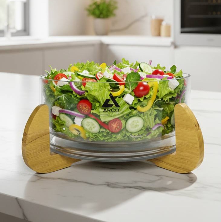 کاسه پذیرایی آرکو (Arco) با طراحی مدرن و مینیمال، انتخابی ایدهآل برای میزهای پذیرایی شیک است. این محصول شامل یک ظرف شیشهای با کیفیت بالا و شفافیت خیرهکننده است که بر روی یک پایه چوبی مستحکم و خوشتراش قرار میگیرد. ترکیب شیشه و چوب، گرمای خاصی به سفره و میز شما میبخشد. مناسب برای سرو انواع سالاد، میوه و خوراکهای سرد.